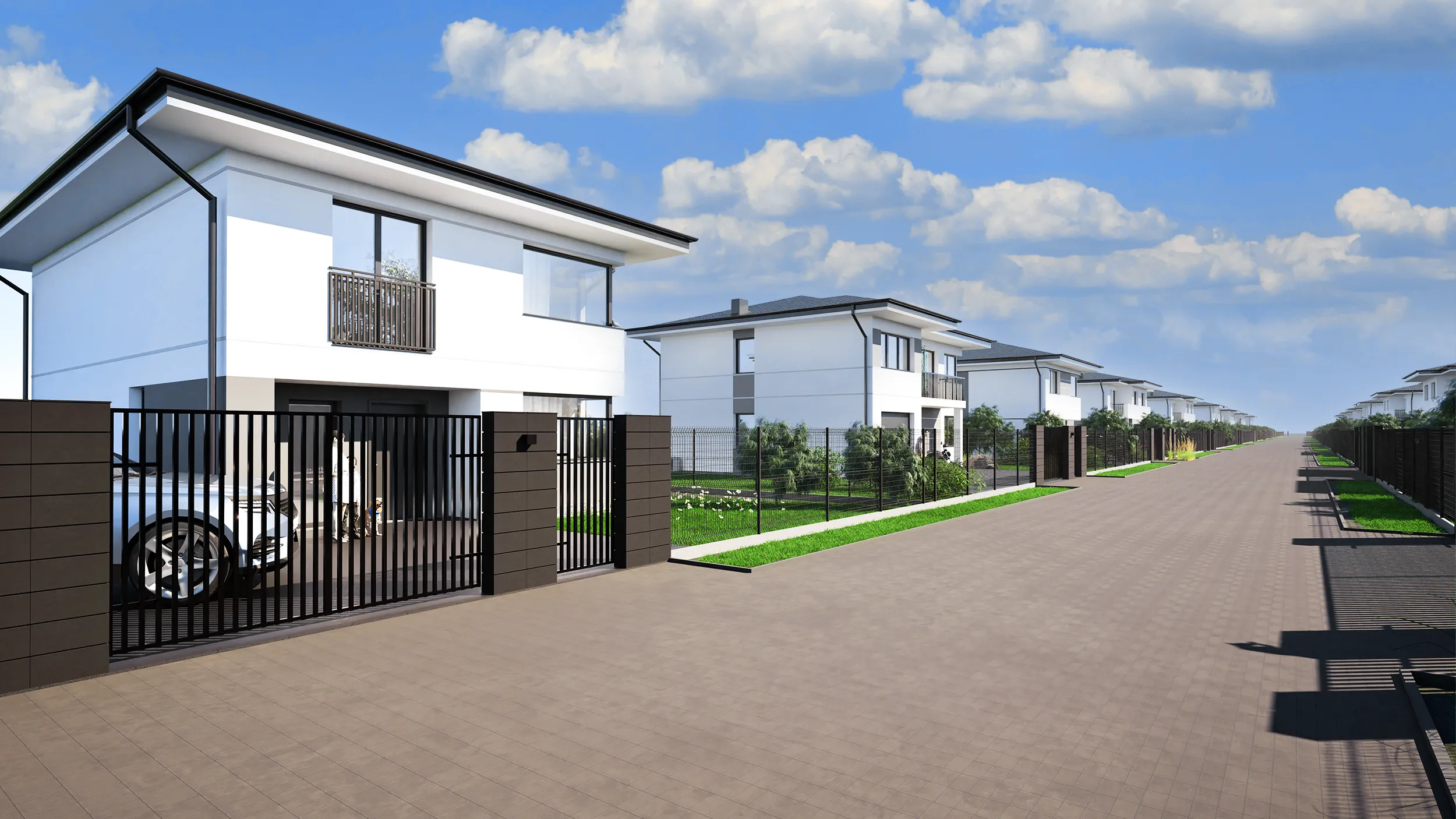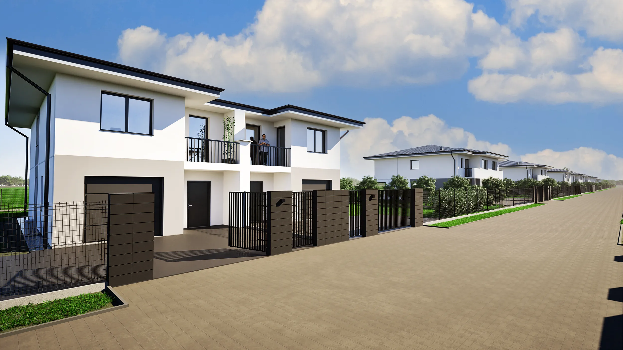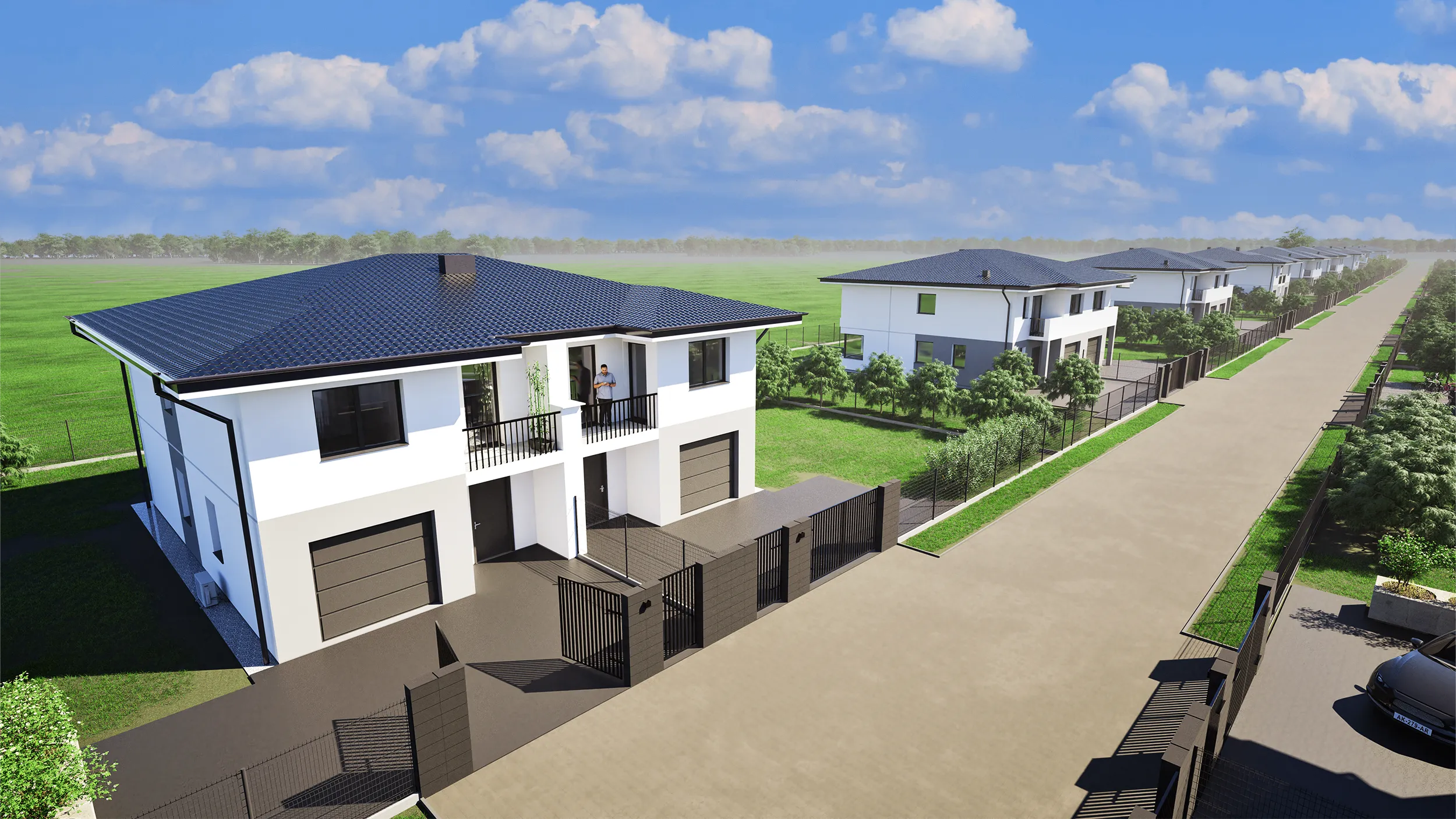 Osiedle o wygodnym układzie funkcjonalnym. W nowoczesnej i prostej dobrze doświetlonej bryle, w której jasne wykończenie elewacji, grafitowe dachy i okna sprawią, że domy będą prezentować się bardzo efektownie oraz będą idealnie wpasowywać się we współczesne trendy.