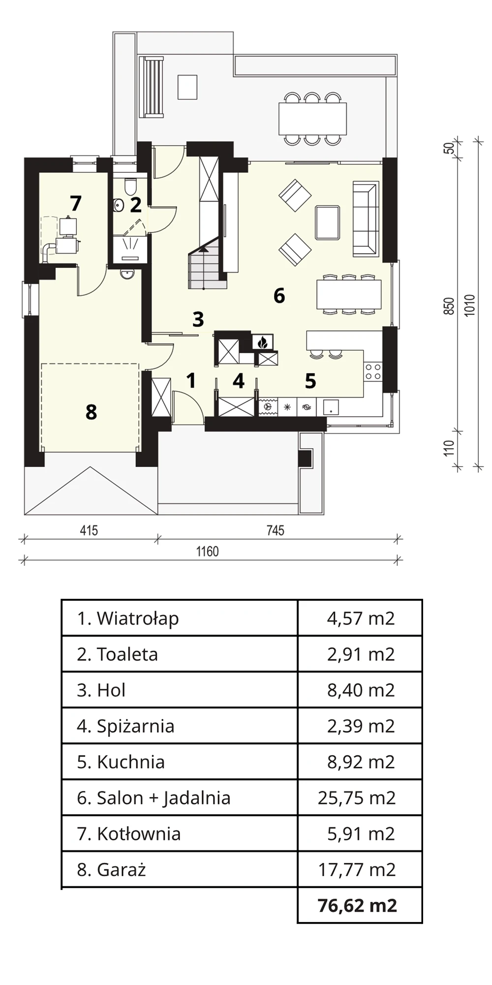 4 pokoje, 1 kuchnia, 2 łazienki, pralnia, spiżarnia, kotłownia, garaż